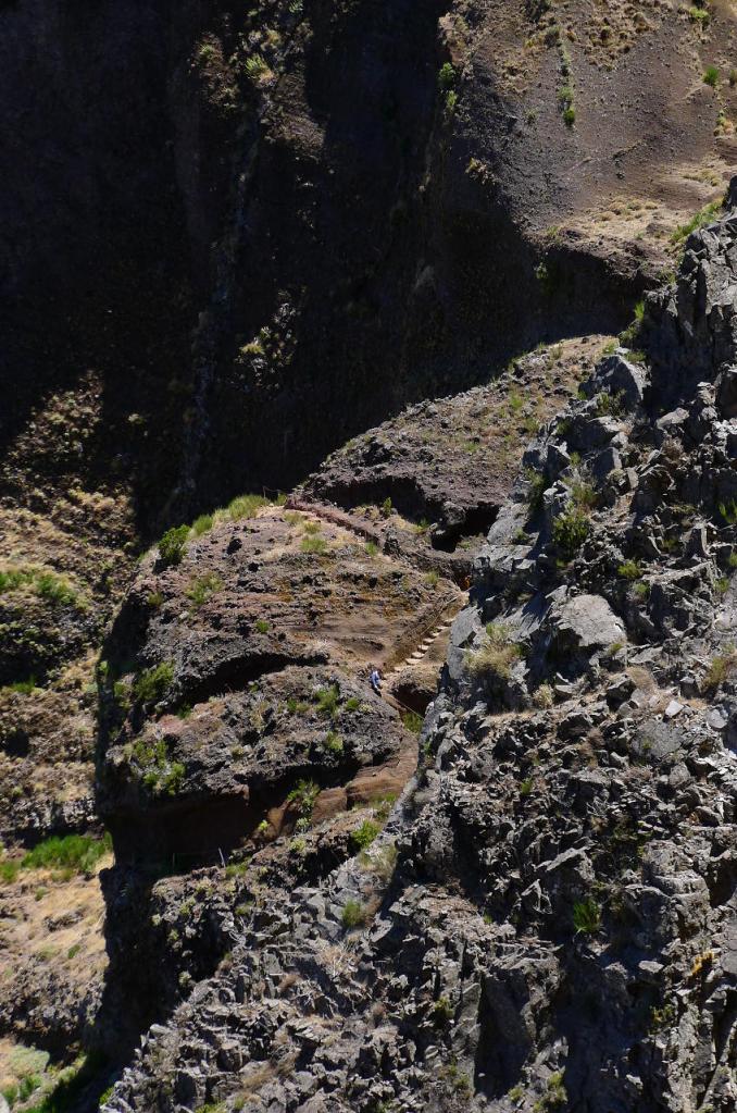 A partir de aquí una sucesión de escaleras, tramos bordeando la pared, túneles, siempre entre un paisaje de pitones volcánicos y profundos barrancos, con rocas de colores rojizos, ocres y negros, poco a poco más protegidos del viento.