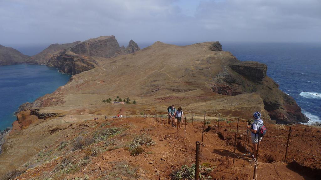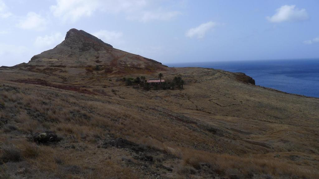 Después se asciende hacia una cresta con otro mirador y habrá que pasar por la parte más estrecha de recorrido. Ya vemos una amplia vaguada donde se encuentra la Casa do Sardinha (55m 1h13′), un centro del Ministerio de Medio Ambiente, con palmeras alrededor, pero que parece abandonado. Por su izquierda se toma una senda que asciende al pico do Furado (170m 1h34′), con pendientes más fuertes de resbaladiza arenilla.