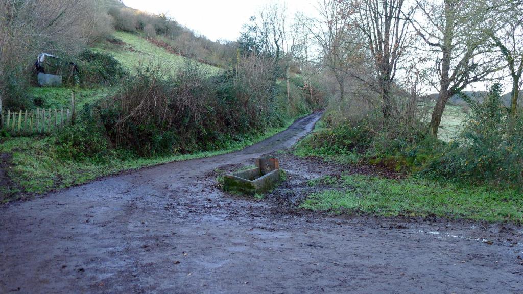 El aparcamiento está junto a un abrevadero (540m). La pista cementada está muy resbaladiza, húmeda con hojas y verdín. Traspaso una portilla abierta (625m 0h09′) y sigo la pista a la izquierda, que está totalmente embarrada. Hay una segunda portilla (677m 0h24′) cerrada y, a los pocos metros, un camino a la derecha donde hundo las botas en el barro y con fuerte pendiente.