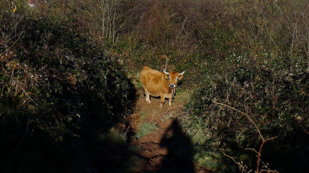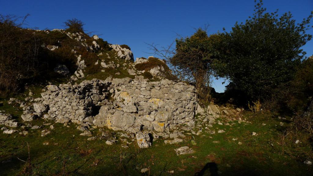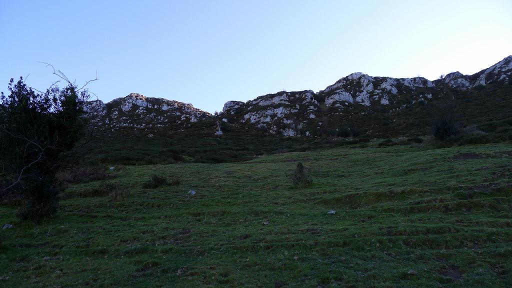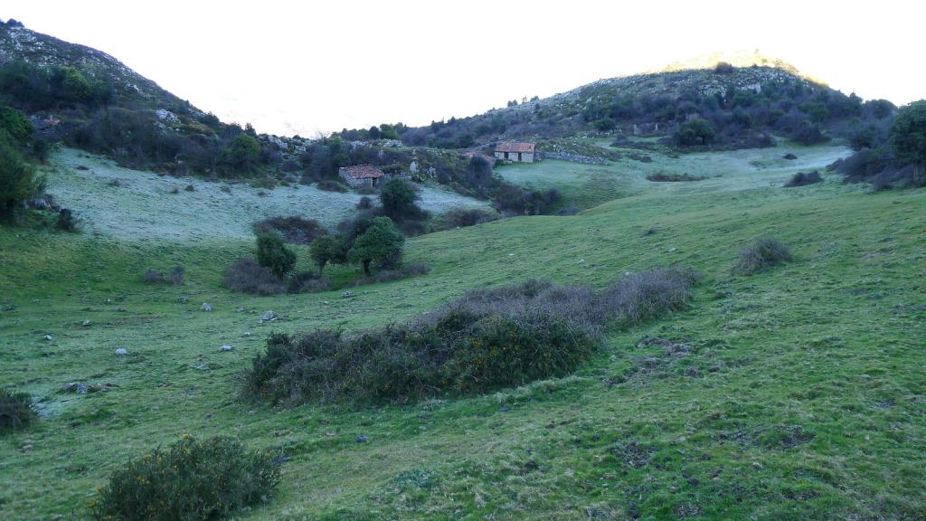 El camino faldea por el N el Cazminín. Se llega a un prado donde el camino es más confuso. Sube a un colladito al E del Cantu Curillón y pasa a una hondonada donde están las cabañas de Vega Campo (940m 1h06′).