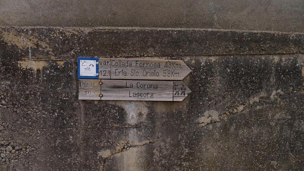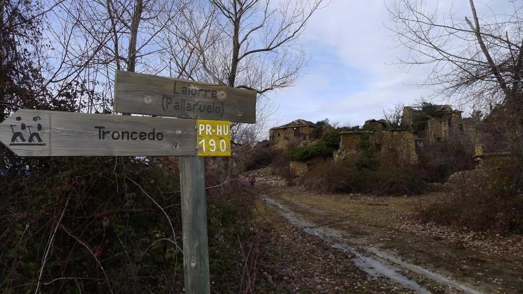 El primer pueblo abandonado es Latorre (1155m 3h51′). Desandamos unos metros y volvemos a tomar el PR por senda hasta una pista (1100m 4h093′) de nuevo. Un edificio bastante conservado a nuestra derecha es un horno de tejas (1070m 4h22′). Poco después está el siguiente pueblo, Lavilla, del que se sale por un camino de antiguos campos trabajados con sus muretes de piedra.
