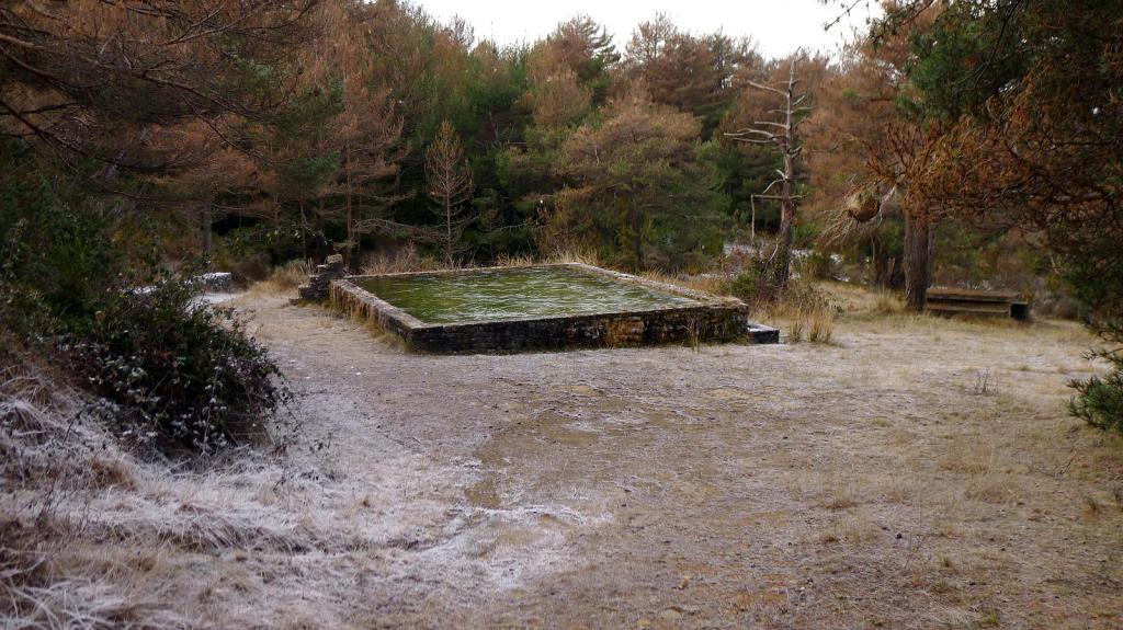 Salimos del pueblo de Rañín (830m), por una pista por el N del pueblo en dirección E. Está balizada con postes de punta azul. Se pasa junto a la balsa de la Fuen d’Arbit (975m 0h28′), cuya superficie está helada. Más arriba dejamos la pista desviándonos por una senda a la derecha, marcada con un hito (1030m 0h42′), bajo la línea eléctrica.