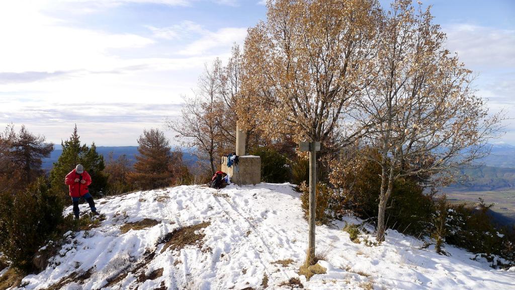Desembocamos en una pista que, en pocos metros, alcanza el pico Campanué (1549m 2h16′). El descenso lo hacemos por esta pista, marcada como PR-190.
