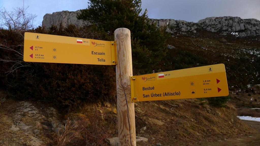 He tenido que cambiar de planes, pensaba acercarme a Escuain para subir a Cuello Viceto, pero la carretera estaba helada y me he dado la vuelta. Como recurso he pensado en tomar el GR-15 en Bestué para subir a Collado Ratón, que se asoma a la garganta de Escuain, y ver como está la cresta en dirección a Cuello Viceto.