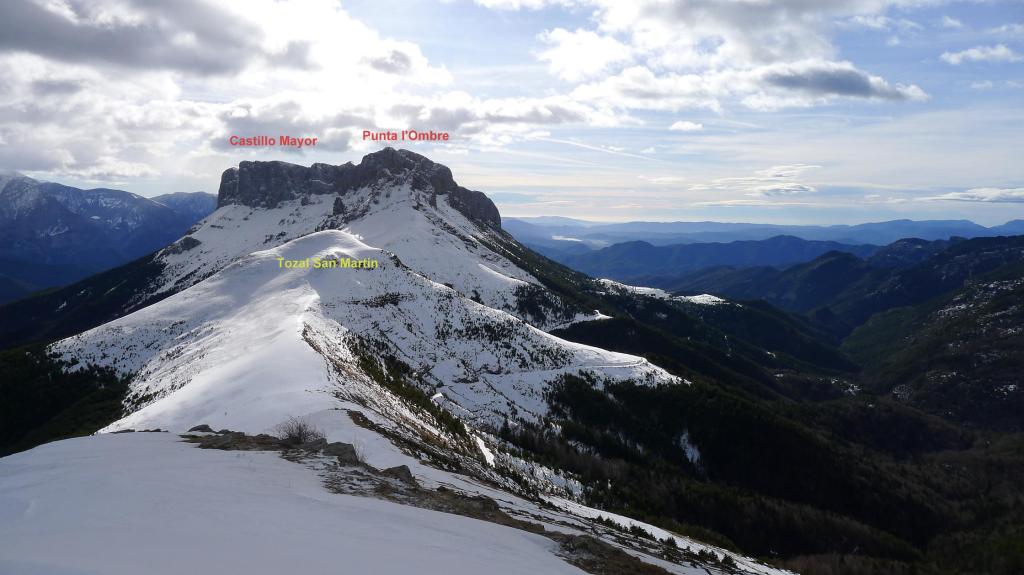 Salgo de Bestué (1235m) por el GR-15, siempre bien señalizado, por una senda entre muros de campos trabajados y con bastante pinchos, que asciende hasta desembocar en una pista (1435m 0h36′). Sigo la pista, con nieve y rodadas heladas, bajo las paredes de Castillo Mayor, hasta que, después de pasar una barrera canadiense, un cartel indica desviarse a la derecha por senda de nuevo (1560m 1h06′).