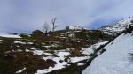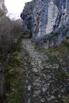 Se atraviesa el río por varios puentes y se llega a un estrechamiento (777m 0h24′). Más arriba hay otro cruce del río sin puente (910m 0h55′) y no veo otra alternativa que ponerme las polainas y pasar mojándome completamente las botas. El camino se va convirtiendo en una senda, siempre sin pérdida, y asciende por un valle más estrecho junto a la orilla izquierda del río, pero convertida la senda a su vez en un río debido a las lluvias de ayer y al deshielo; ya no es necesario buscar por dónde mojarse menos porque no hay opción.