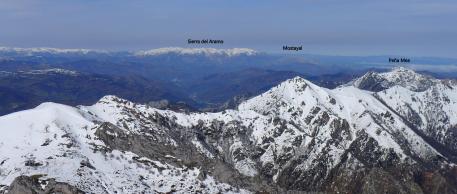 Se llega a una zona más amplia del valle con muchas cabañas, la majada Mayaín (1170m 1h20′). Enfrente, al N, está el collado Felguera, pero yo me voy un poco a la derecha, por pastos nevados, hacia el collado Valencia. Cruzo una pista (1190m 1h23′) y calzo las raquetas para subir la suave ladera nevada que conduce al amplio collado Valencia (1305m 1h53′).