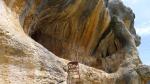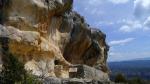 Salimos de balsa superior y tomamos una pista hacia el norte. la dejamos entrando por una senda a la derecha (850m 0h54′). Más arriba otra desviación a la derecha (935m 1h09′) nos lleva con pendiente más fuerte hacia la pared rocosa llena de oquedades donde encontramos el abrigo de Quizáns (1055m 1h26′). Las pinturas rojas, que hay que buscar con lupa y solo son unos trazos en la pared, están protegidas por una verja; sin embargo las vistas del Somontano y la sierra de Guara son estupendas. Existe una ruta circular que nos llevaría al abrigo de Chimiachas, donde parece que hay dibujos de cérvidos más claros, pero será en otra ocasión.