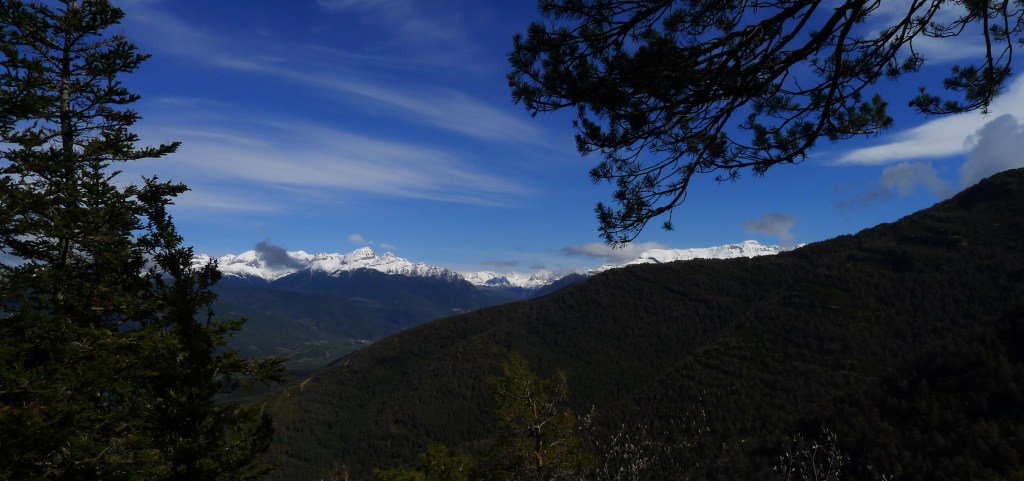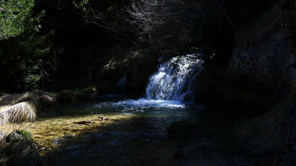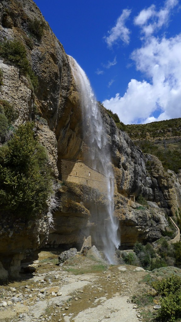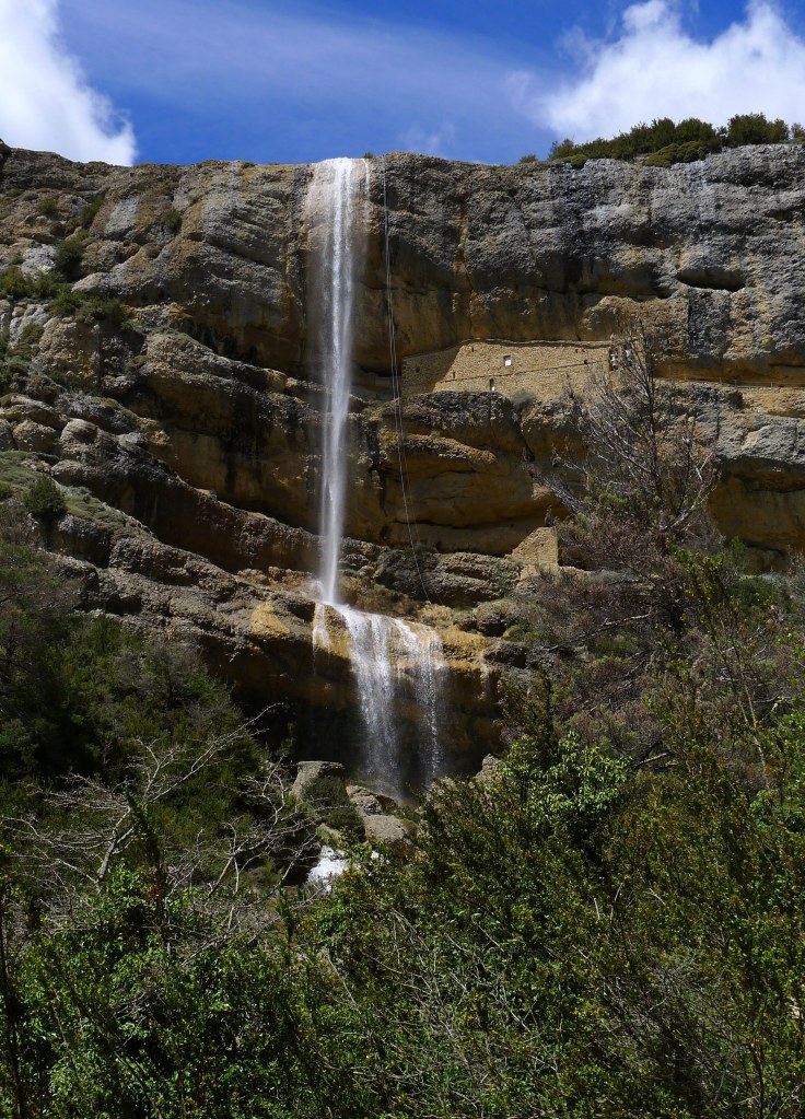 Salimos de Satué (915m) por encima de la iglesia de San Andrés, siguinedo marcas del PR-HU-5 (amarillo-blanco). La senda asciende por pinar y se introduce en el barranco de las Gargantas. Cruzarlo junto a un salto de agua es algo delicado debido al caudal (cruce del barranco 1418m 1h27′). El recorrido es fresco, umbroso y con el sonido del agua siempre presente.