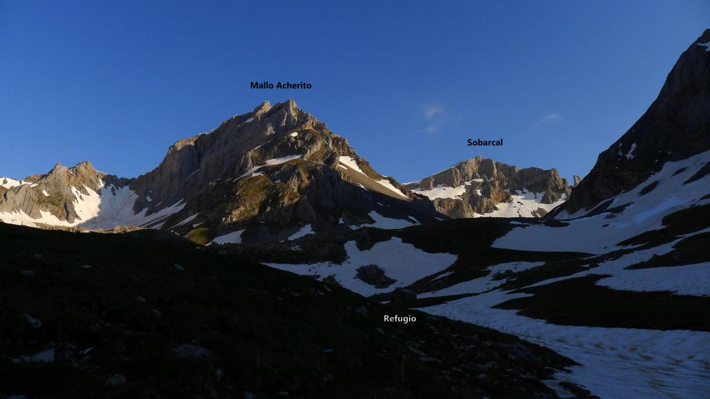 Refugio de la Mina (1228m). Hay que tomar el lomo de hierba para acceder a un sendero (balizado en verde-amarillo) que asciende por la orilla derecha del barranco de Acherito. Pasar un par de barrancos laterales, con las aguas crecidas, es algo problemático, pero buscando el sitio adecuado se puede hacer. Cuando se llega al circo de la cabecera del barranco encuentro el refugio de Acherito (1707m 1h24′) de techos ruinosos.