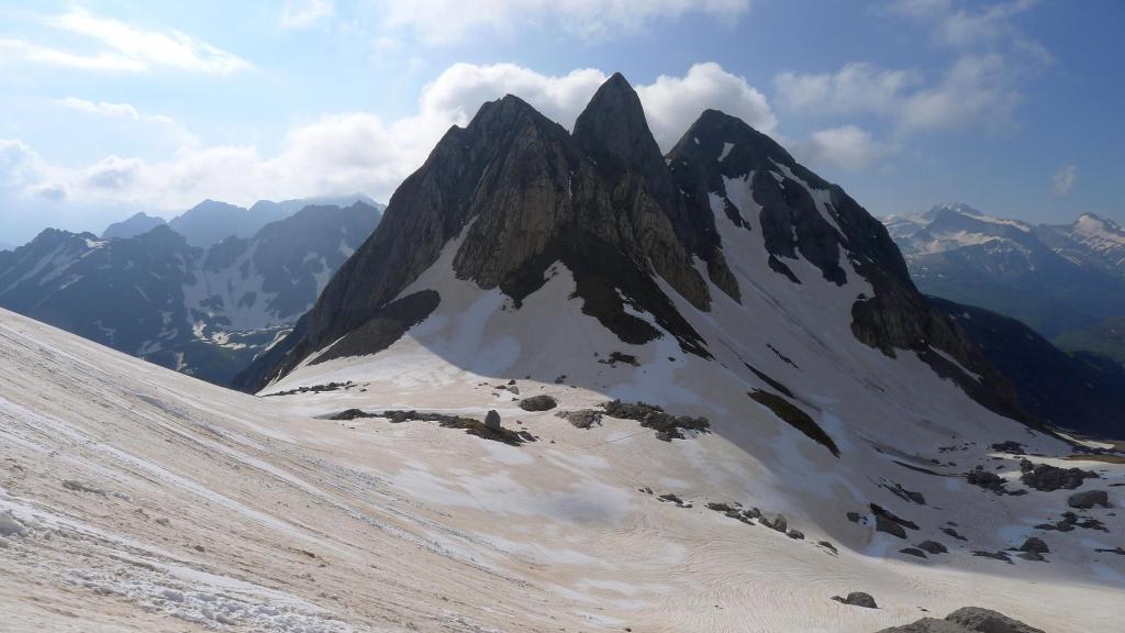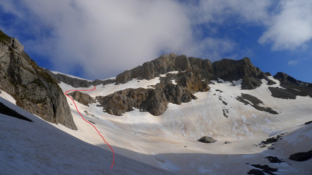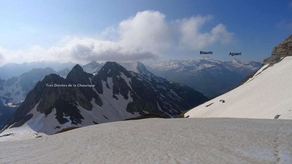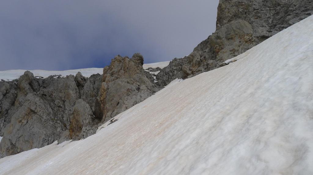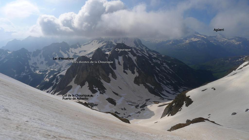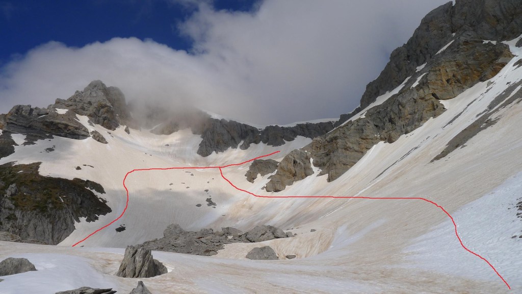 Enseguida tengo que calzar crampones. Dejo a mi izquierda los contrafuertes del Mallo de Acherito y me interno por fuertes pendientes nevadas a mi izquierda entre el Mallo de Acherito y el pico Sobarcal. El collado entre los dos está defendido por una muralla rocosa. Localizo una chimenea que parece practicable, pero por encima hay una enorme cornisa vertical de nieve en la que no me pienso meter; así que alcanzo los 2135m (2h38′) (el colaldo de Sobarcal está a 2178m) y desciendo un poco para dirigirme al este, al puerto de Acherito o col de la Chourique (1900m 3h03′). Las nieblas procedentes de Francia se elevan formando nubes algo amenazadoras.