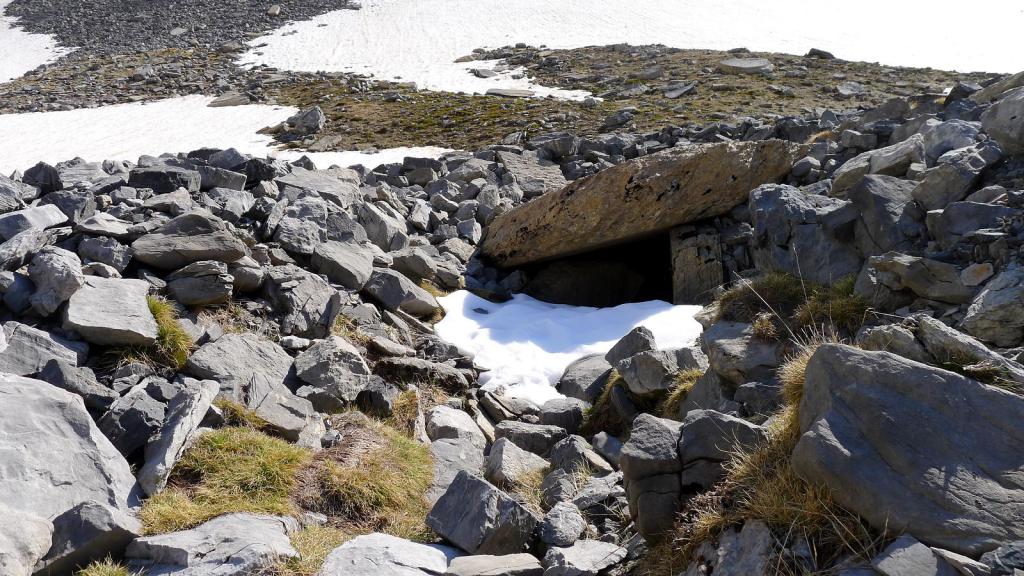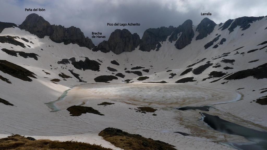 Decido, ya que todavía es bastante temprano, hacer el recorrido circular por el ibón de Acherito, así que bajo hacia el refugio pasando por el dolmen (1777m 3h23′), algo oculto entre un túmulo de piedras, y me desvío a la izquierda (1728m 3h30′) para tomar una senda que asciende suavemente por la ladera (ESE). Siguiéndola se llega al ibón de Acherito (1887m 4h06′), que todavía permanece helado y con los picos que lo rodean cubiertos por nubes negras.