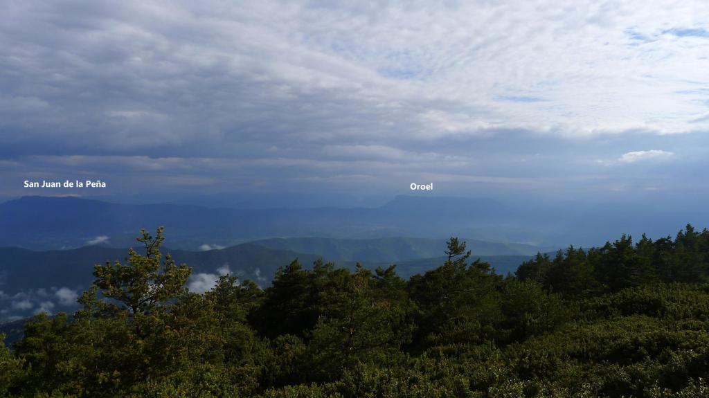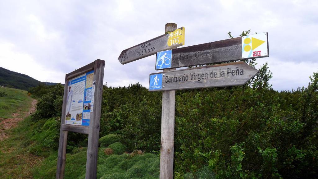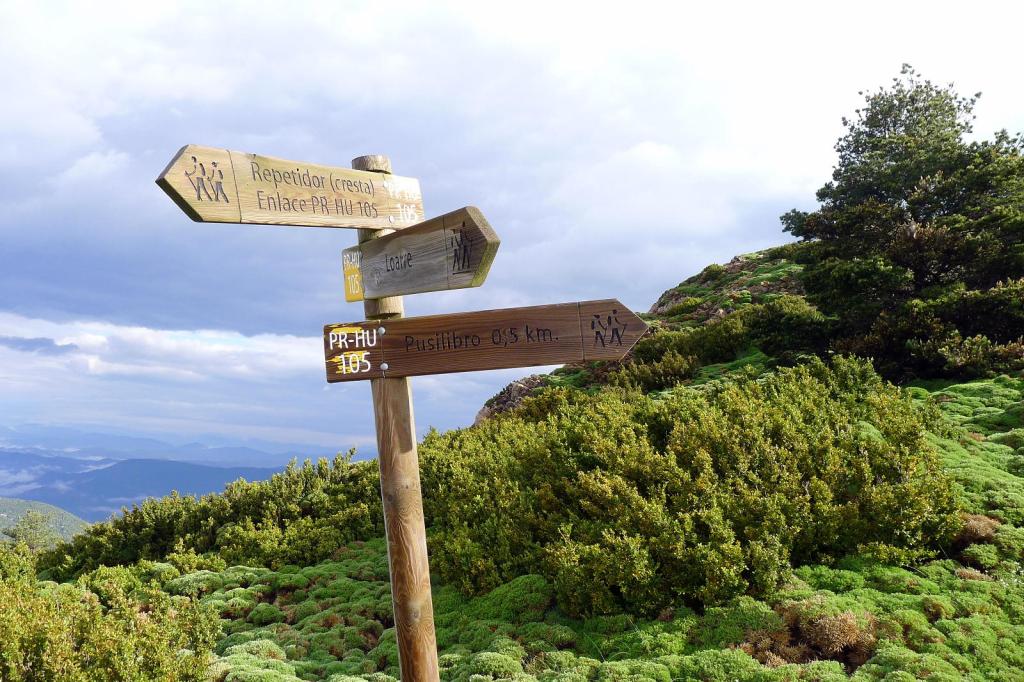 Hoy completo su ascensión sin encontrar ni extraterrestres ni humanos. Salgo del aparcamiento del castillo (1070m) por el PR-HU-105 bordeando unos prados y enseguida entro en zona boscosa, llegando a una bifurcación que tomo a la derecha (1120m 0h10′). Cruzo una pista y más arriba tomo la pista (1347m 0h33′), para salir de ella hacia la izquierda tras unos metros por zona de erizones.
