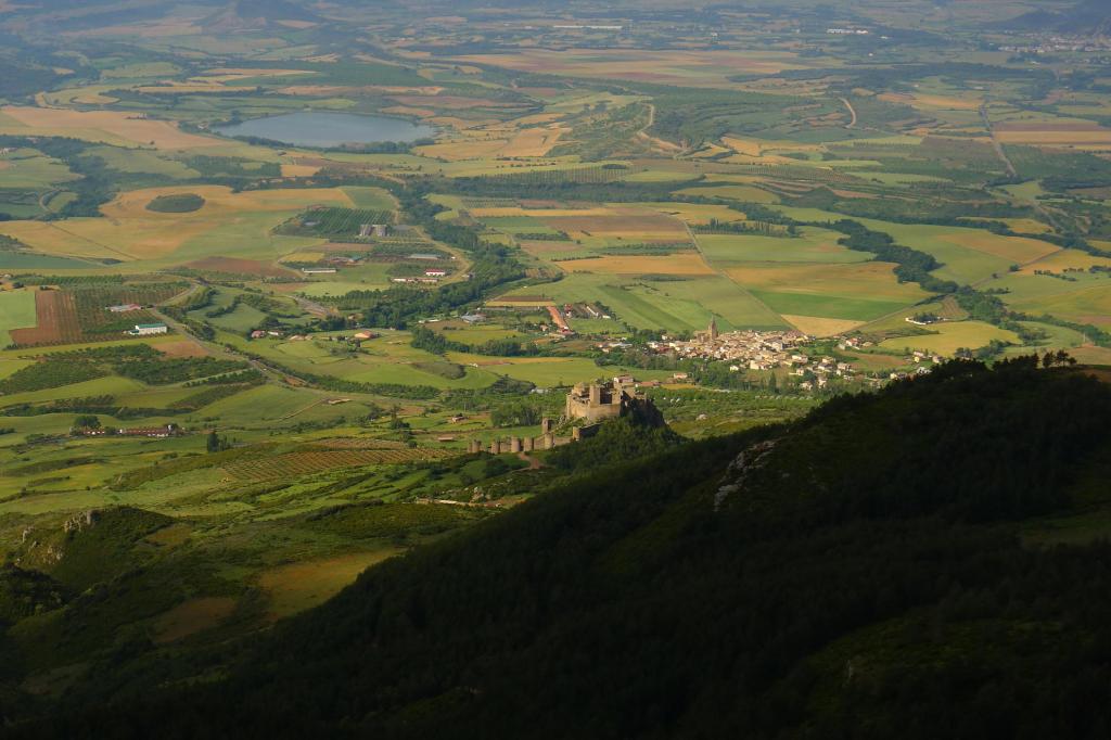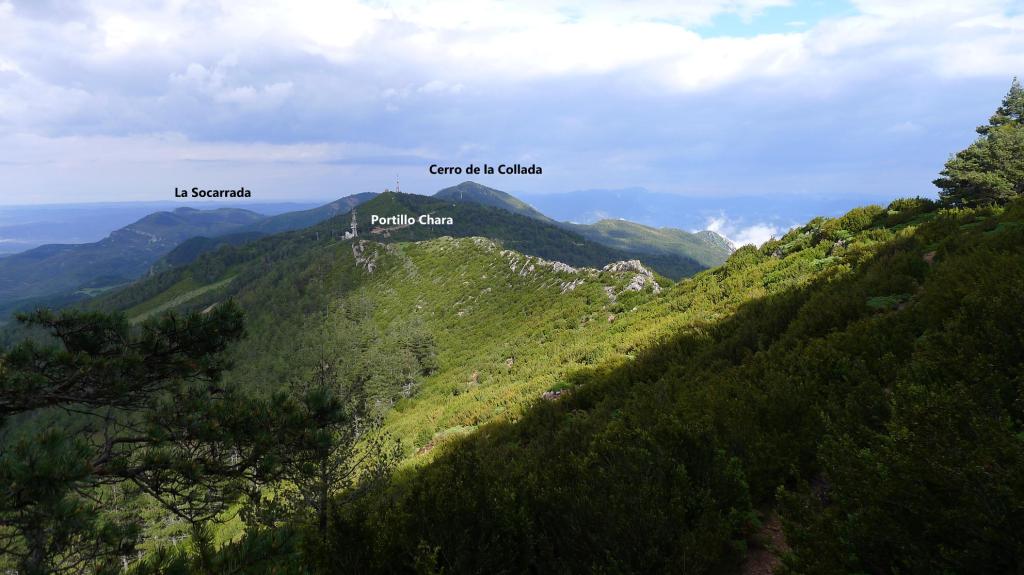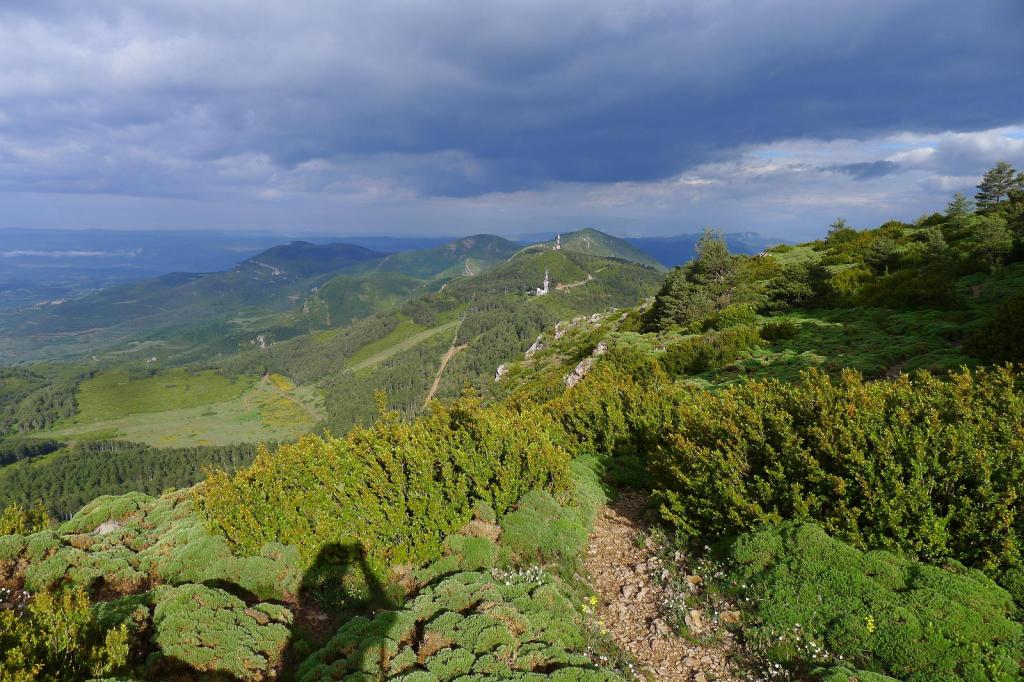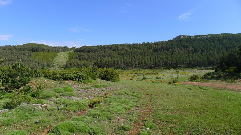 Al bajar, en la última bifurcación, voy a la derecha, hacia las antenas del portillo Chara. El sendero deja esta cresta y desciende, cruza una pista (1334m 1h46′) hasta desembocar en el plan de Lugas, donde hay un refugio (1278m 1h57′) en muy buen estado. Por estos prados se desdibuja un poco el camino. Llego a unos resaltes rocosos que constituyen un buen mirador (1160m 2h07′) del castillo. Enseguida llego a la primera bifurcación y desciendo al aparcamiento (1070m 2h16′)