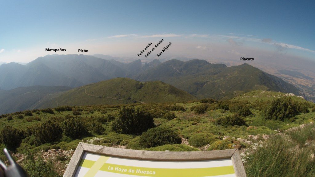 Más arriba está la bifurcación a la ermita de Ordás (1565m 1h01′), tomo el ramal de la izquierda, llegando enseguida a la carretera (1575m 1h03′) donde ya tengo a la derecha el pico sur con las antenas y a la izquierda el pico norte. Me dirijo al pico norte tomando una sendita que alcanza la cumbre (Pico norte 1630m 1h11′). Después voy al pico sur (1619m 1h34′), con paneles de orientación y y una gran vista sobre la Hoya de Huesca. Hoy es un día muy neblinoso. Este pico, con sus antenas, es un punto de referencia muy visible desde Huesca.