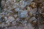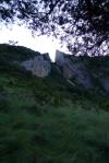 Se pasa por unos prados desde los que se ve al fondo una brecha hacia la que subo por una pedrera, hay algo de senda por su izquierda. Llego a la brecha (1105m 1h26′). Busco durante un rato, pero el inicio de la ferrata está algo más abajo, escondido a la derecha de la pedrera (1h58′), hay hitos que no había visto.