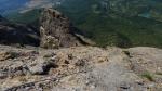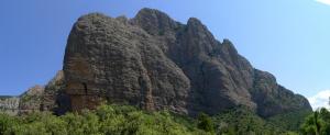 Continúa la senda (sur) con hitos, hasta iniciar el descenso por roca con pendiente suave. La pendiente se acentúa y comienza la ferrata de la Mora (sirga de descenso 1050m 3h07′). El principio es fácil, pero luego hay tramos bastante verticales hasta el collado del Mirador de los Mallos (985m 3h23′). Al Mirador de los Mallos/Punta Varella (1003m 3h35′) se sube con ayuda de una sirga en un ascenso fácil y rápido. Lástima que hay mucha calima y apenas se ven los Mallos de Riglos.