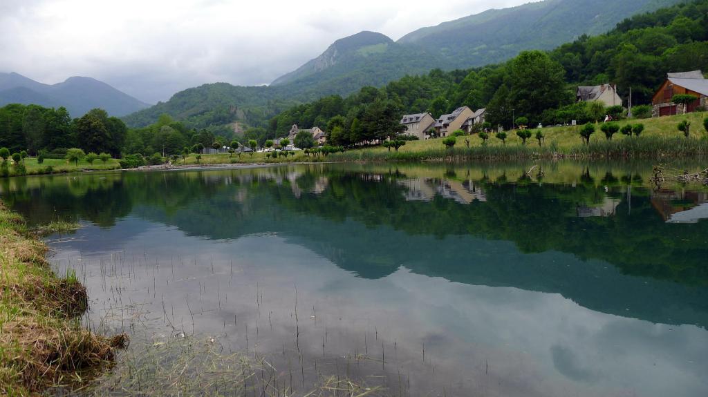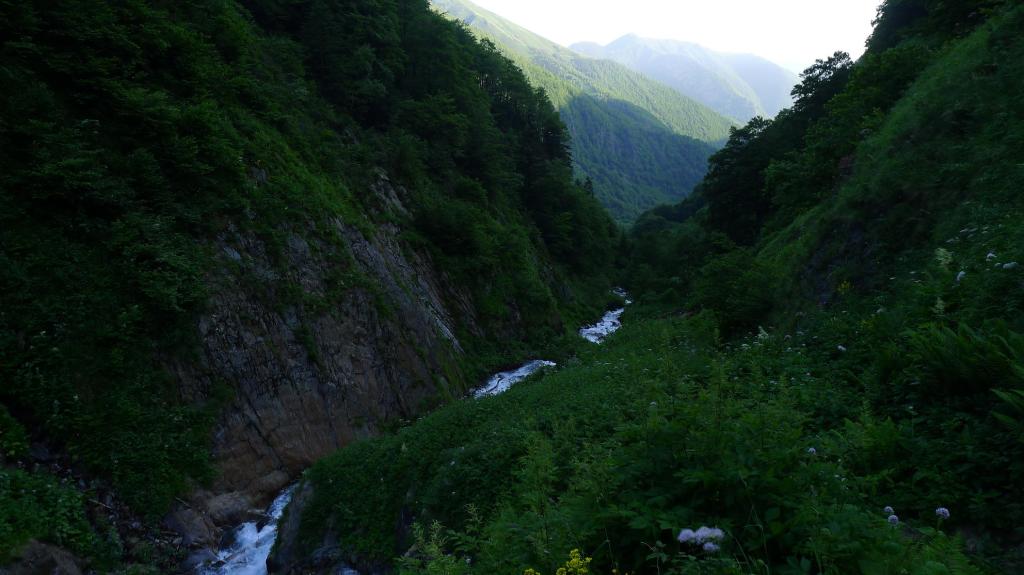 Al este de Bonac, en Lascoux, se toma una carretera hacia el sur. Mejor no cruzarse con otro coche porque es muy estrecha. A 5,5km se llega al parking la Pucelle (881m). De ahí sale un buen camino por hayedo a la orilla izquierda del río Orle. Hay una bifurcación, tomo el ramal de la izquierda (1080m 0h27′). Más arriba hay que cruzar el río (1442m 1h08′); un grupo numeroso está vadeándolo y me fijo cuál es el mejor paso.