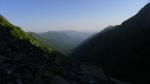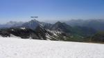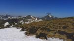 Antes de llegar a la cubeta del lago que hay en la parte superior de la cuenca, cruzo el torrente (2450m 3h43′) y subo directo por fuerte pendiente de hierba (W y WNW) hasta el lomo sur del Mail de Bulard. El suave lomo, en dirección N, atravesando otro par de neveros, lleva a la cumbre (Mail de Bulard (2750m 4h18′). En la plataforma cimera hay un vivac de pizarras. Muchas lenguas de aludes han caído desde las laderas a mi alrededor.