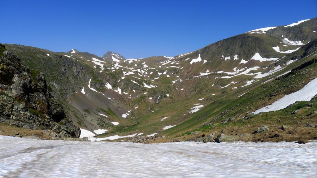 Desde el puerto, ya en vertiente española, sale hacia el NW un camino que llanea a media ladera a una altura de 2340m; es el GR-211 y también hay algún nevero. Hay que dejarlo desviándose a la derecha (N) para subir por la orilla izquierda de un torrente (barranc deth Pietà) a la altura de un laguito (2340m 3h27′).