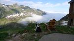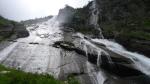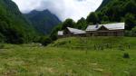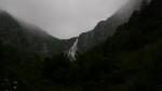 Se llega a un rincón espectacular, la cascada de Nerech (1348m 1h05′); caen cascadas por toda una ladera de roca negra. Un puente bajo la cascada pasa a la orilla derecha y se asciende por un camino bien acondicionado en la pared. Continúa una zona de vegetación baja, otra cascada a mi derecha (cascada de Lauze) y mucha niebla. Por terreno de pasto llego a la cabaña des Caussis (1859m 2h06′).