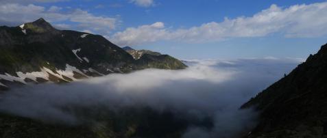 El ascenso es fuerte hasta el refugio de Estagnous (2240m 2h56′), con una ubicación privilegiada, un balcón en un espolón de la montaña con el lago Étang Rond debajo. La niebla despeja y empiezo a ver el cielo. El camino, que deja los pequeños laguitos de les Estagnous a la derecha, tiene ahora una señal amarilla. Evita el espolón rocoso de la izquierda y asciende con fuerza. Hay algunos neveros. Al fin me pongo los crampones.