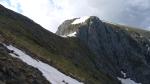 El camino al col de Faustin queda cortado por un gran nevero con mucha pendiente, así que dejo el camino (2710m 4h12′) y continúo directo por la ladera herbosa hasta estar por encima del nevero; sigo un poco oblicuo hacia la derecha hasta la cresta donde ya tomo el camino que viene del collado. Un último nevero antes de la cima lo esquivo por la izquierda y en un corto cresteo me encaramo a la cruz de la cima de Mont Valier (2838m 4h25′).