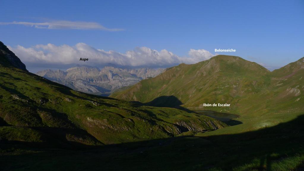 Salgo del aparcamiento superior de Astú (1725m) por la senda hacia el norte que recorre el barranco de Escalar hasta el ibón de Escalar (2070m 0h38′). Desde allí hasta el col des Moines (2160m 0h53′), donde siempre es admirable la vista del Midi d’Ossau.