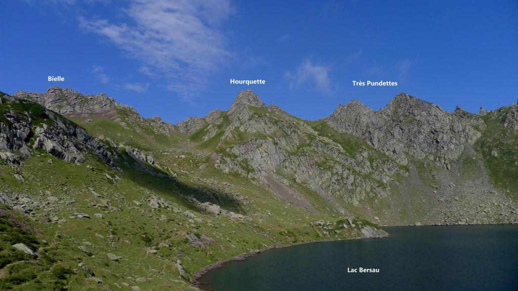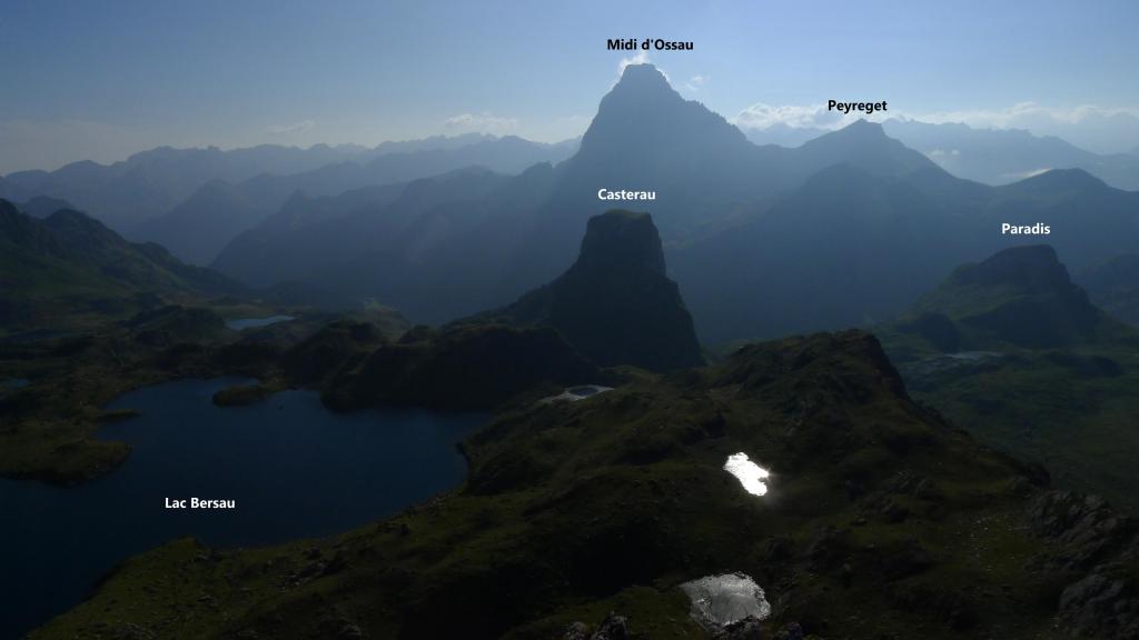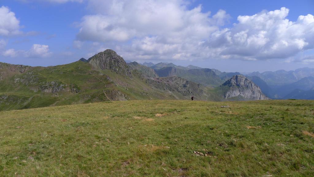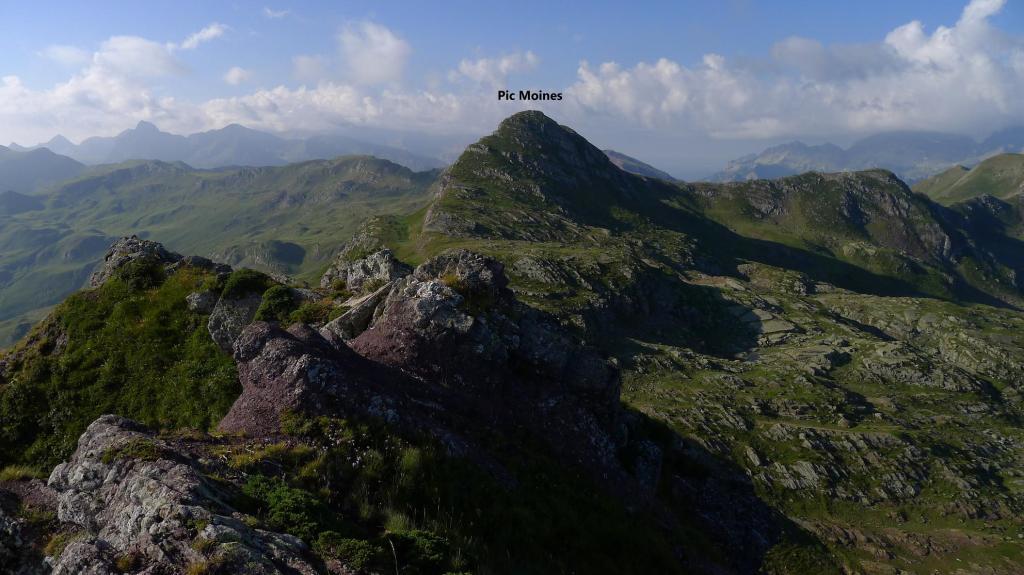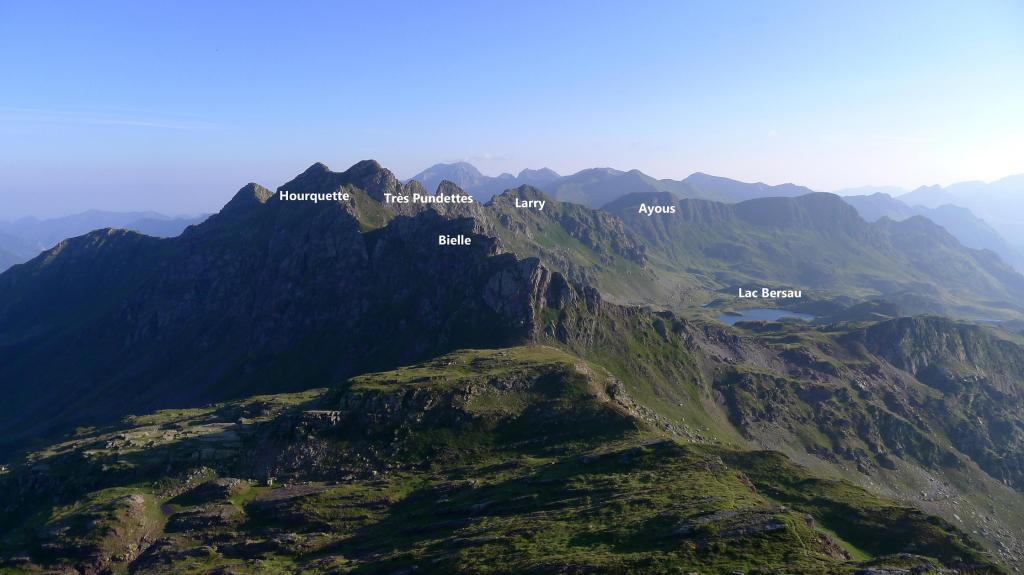 Una agreste cresta se eleva desde el pic des Moines hasta el pic de Larry, separando los valles de Aspe y Ossau. No tiene mucha altura y su aspecto herboso engaña porque las laderas a ambos lados tienen gran verticalidad. Tampoco hay sendas que nos ayuden a encontrar los mejores pasos, así que hay que buscar constantemente la zona de acceso por uno u otro lado. En esta ocasión la recorro hasta el pic de Bielle y luego, ya en el col des Moines, subo también el fácil lomo hasta la punta NW del pico de Astún. En otra ocasión hice el pic Larry y las Très Pundettes, así que me falta el pico que queda en medio, el Hourquette.