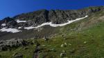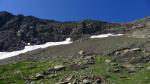 El hayedo se transforma en abetal y luego en terreno despejado. La senda sube con una pedrera de bloques a mi izquierda (1490m 1h04′) por vegetación herbácea alta y fuerte pendiente, dirección SSW. Pasando un resalte llego al lac d’Isabe (1925m 1h49′), enmarcado por potentes paredes rocosas.