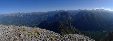 Después hay un gran hito (2080m 1h45′) que da paso a una senda en la pedrera, flanqueando la ladera, hasta que empieza a subir a la derecha una canal (2115m 2h05′). La canal asciende por piedrilla, pero es bastante cómoda. Después otro flanqueo cuesta arriba y otra canaleta rocosa para afrontar la ladera final. Cima de la Peña Montañesa (2295m 2h21′).