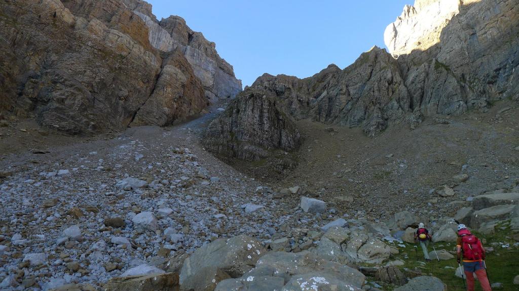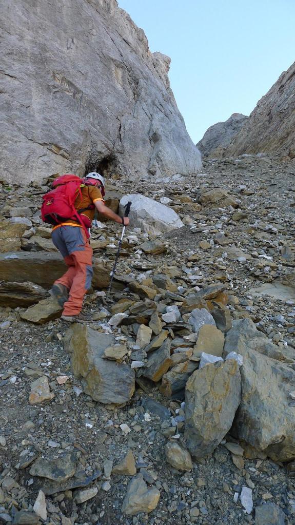 La ruta es evidente hacia el corredor a la izquierda de Telera. Se supera un primer muro y se entra ya en la larga canal de Cachibiriza, jalonada con hitos, que encuentro menos penoso de lo que me esperaba, ya que a pesar de la fuerte pendiente la huella está bien marcada. Seguimos las marcas rojas y llegamos al cuello de Cachibirizas (2340m 2h15′) bajo la Peña Blanca a nuestra izquierda.