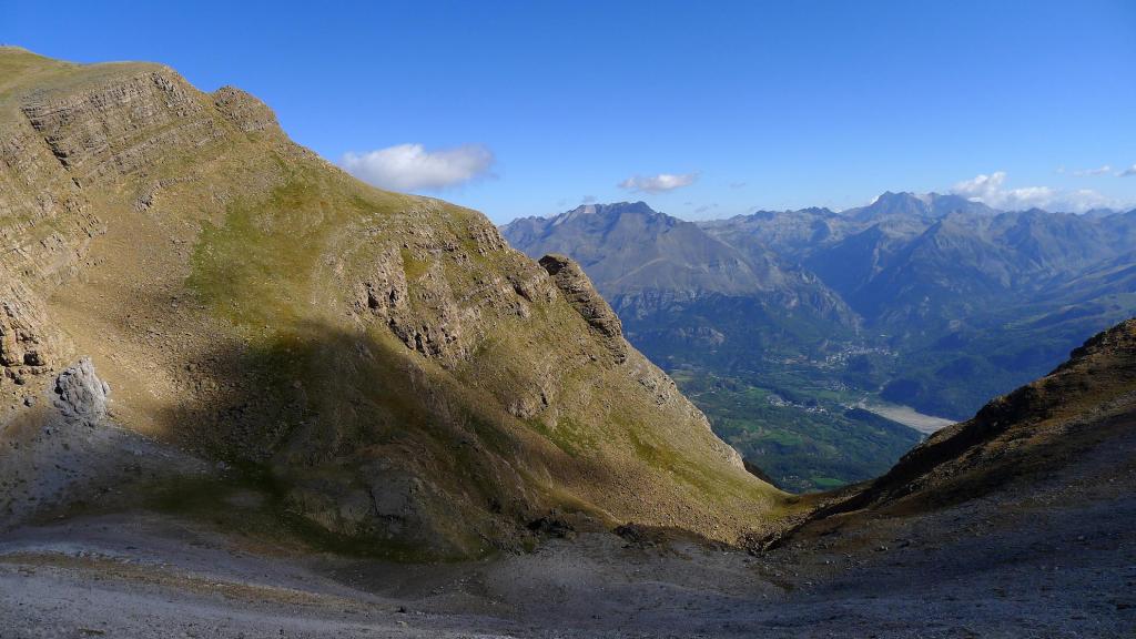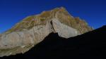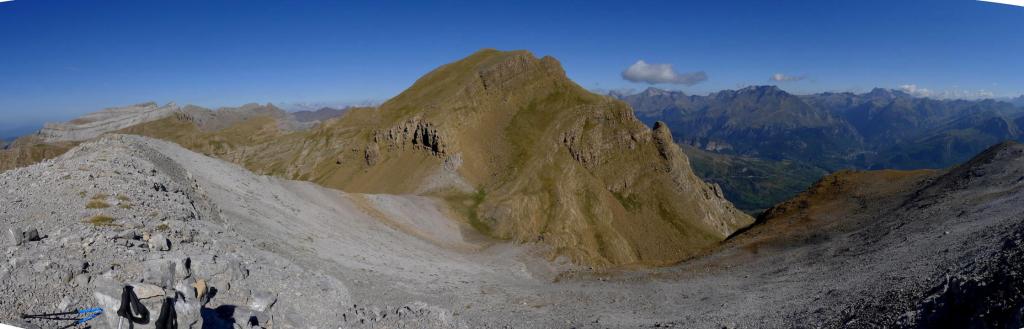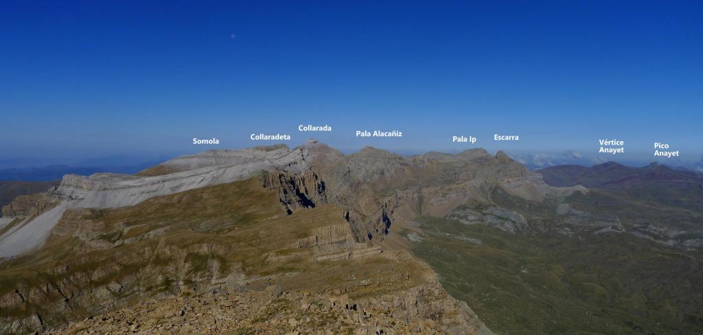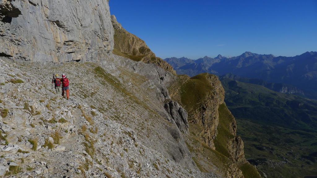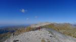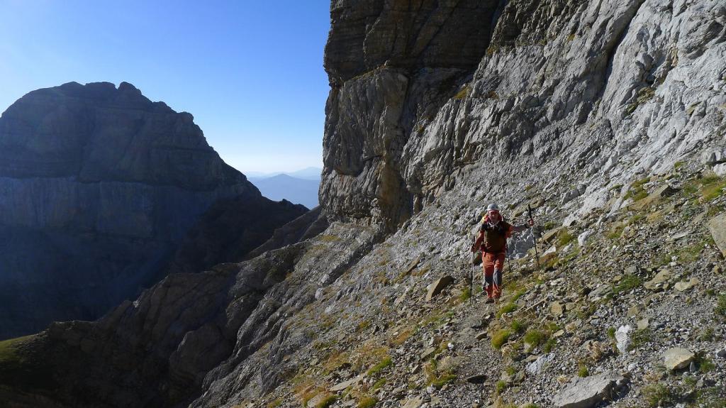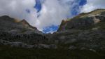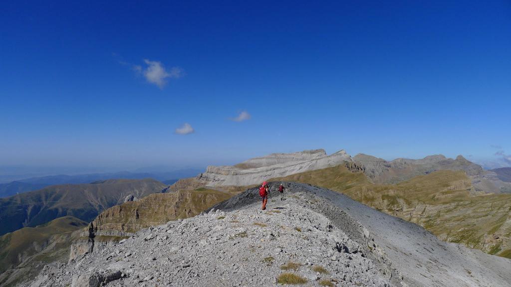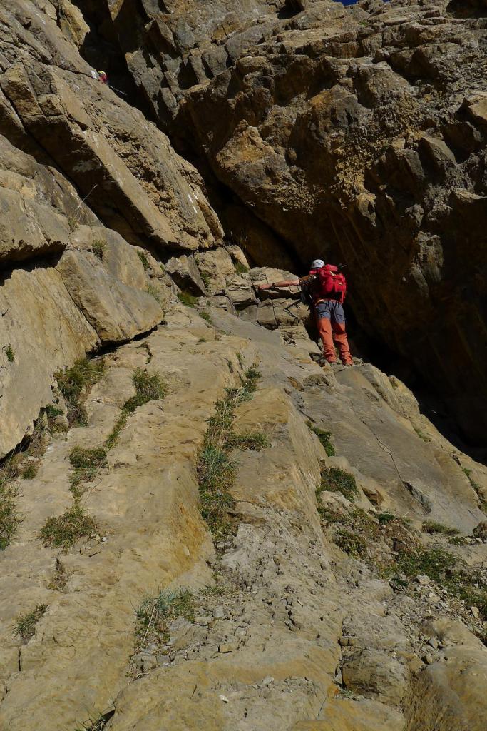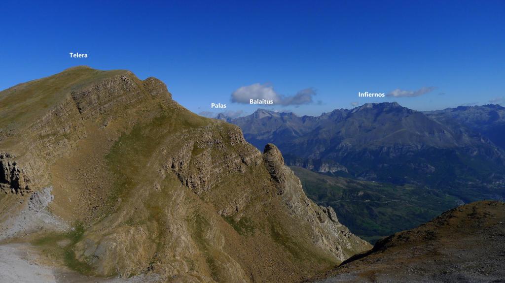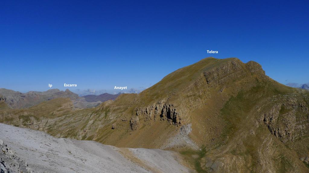 Hacia la derecha (NW) seguimos un poco de cresta y se deja la cresta para entrar en una repisa en la cara este de la pared, flanqueando toda la pared. Nos metemos en una chimenea a la izquierda que no es la correcta; hay que seguir un poco más hasta tomar una trepada para ascender hacia un collado que da a una enorme dolina (2510m 2h57′). Se toma la ladera SE de Telera, siempre muy pendiente y con pequeñas trepadas fáciles, hasta la cima de Telera (2762m 3h28′).