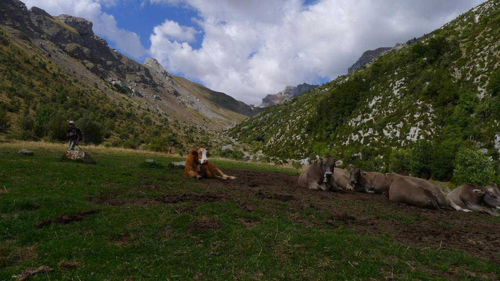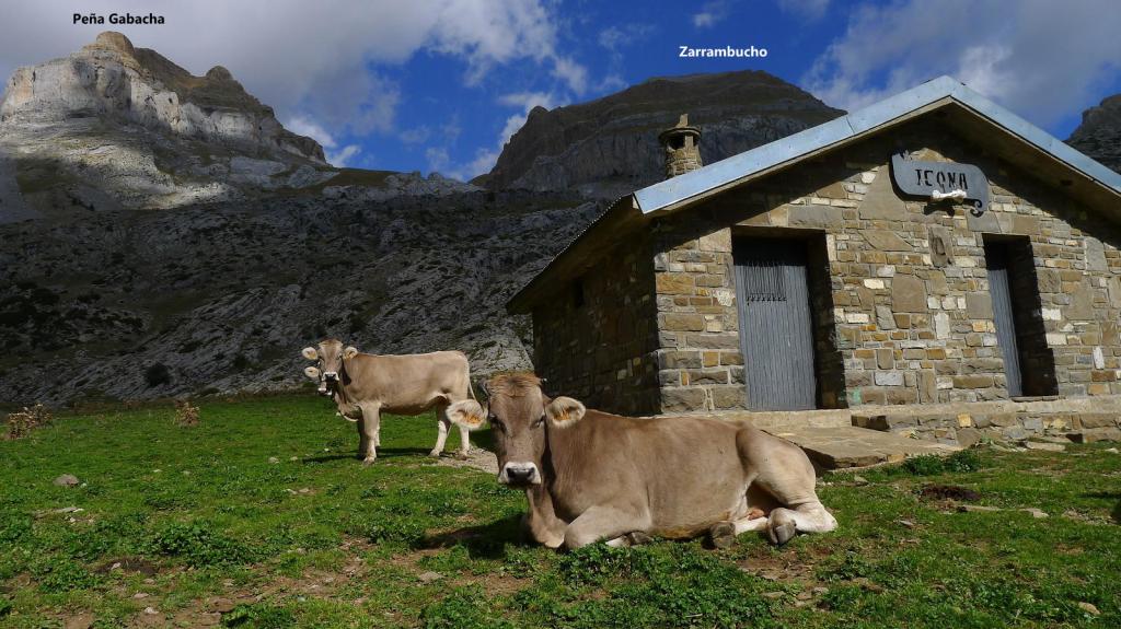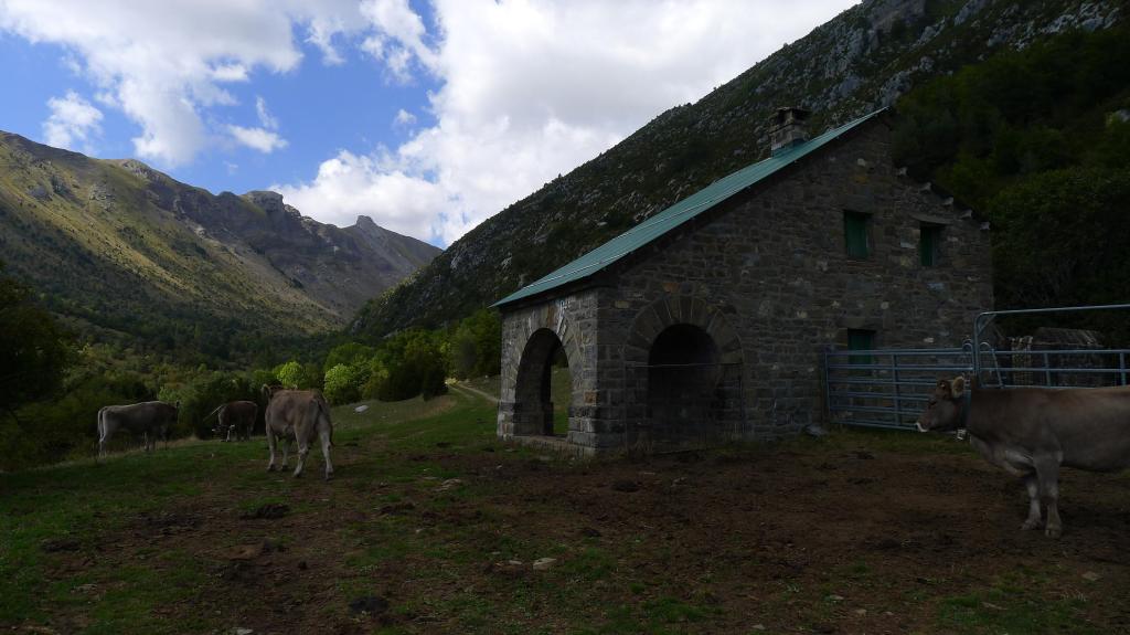 Volvemos al collado (2574m 4h29′) y descendemos hacia el WSW por terreno confuso en el que vamos encontrando hitos discontinuos. Tenemos que rectificar un par de veces. Hay que tomar la vaguada en descenso y desviarse a la derecha para llegar a la vaguada principal de Zarrambucho que desciende hacia el sur. Conectamos con el valle de Zarrambucho en una fuente (2324m 5h07′). Sigue el descenso más o menos por el fondo de la vaguada. Hay alguna traza de senda y luego ya se ve al fondo el plan de Usabas, donde está el refugio de Usabas (1825m 5h57′), en un prado con vacas.
