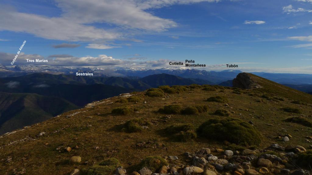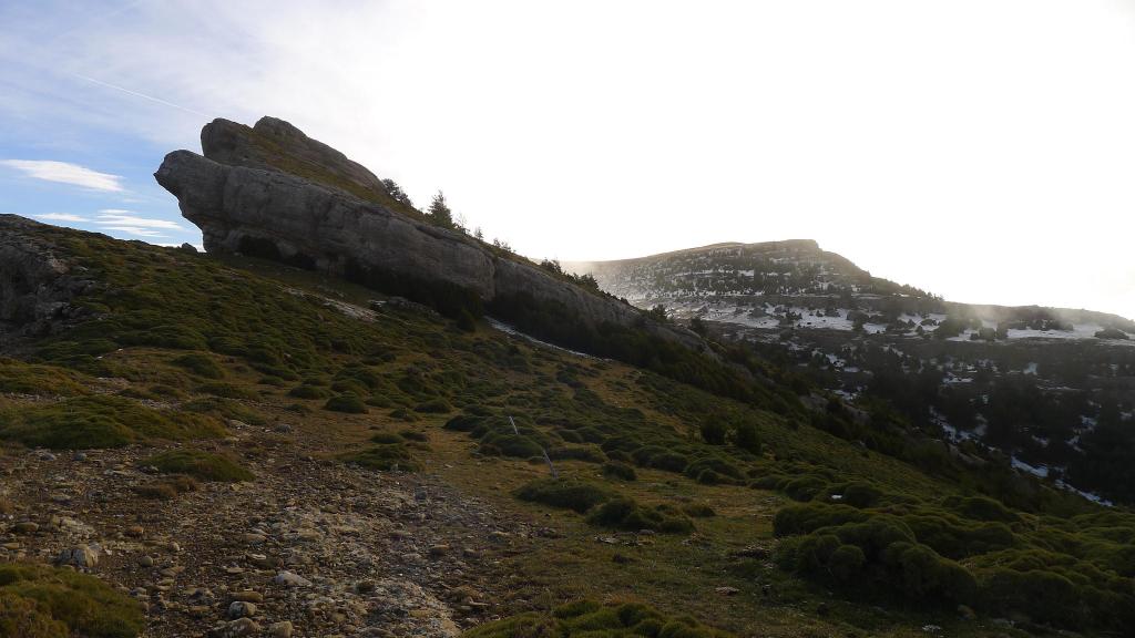 El camino me dirige en descenso por la vertiente sur para luego girar a la izquierda y ascender por una vaguadita bastante directa hacia la Peña Canciás (1929m 3h32′). A la vuelta decido ir cerca de las cresta hacia el collado para evitar perder altura, pero no sé si es muy buena idea ya que hay que atravesar por erizones y hacer pequeños descensos para destrepar resaltes rocosos.