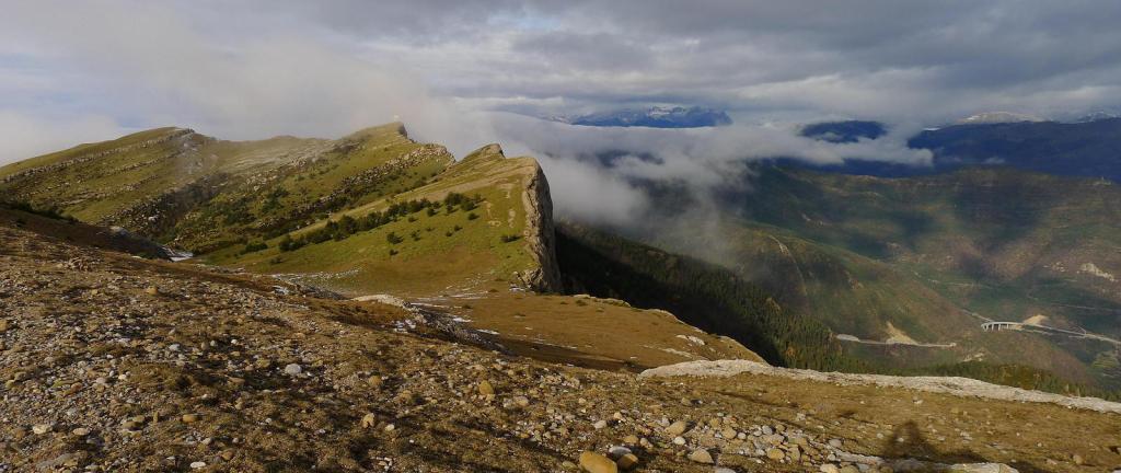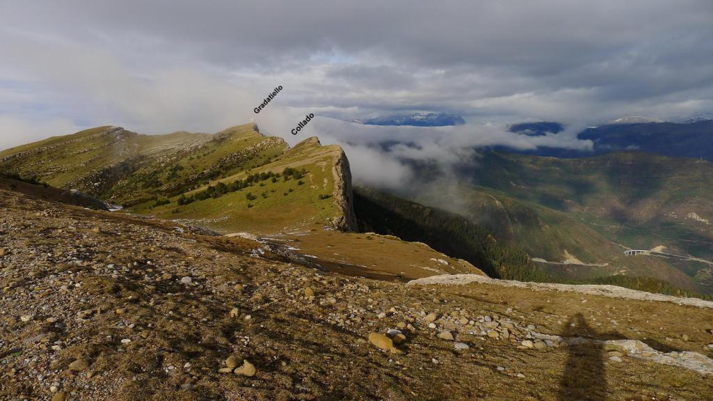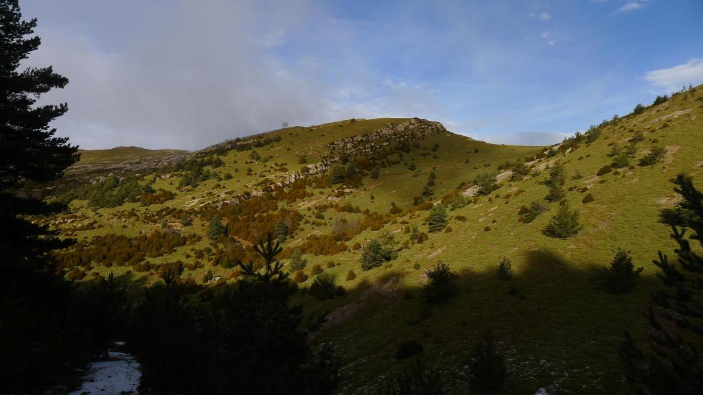Ya intenté esta ruta hace un par de años, pero se puso a nevar y di media vuelta. Hoy es un día fresco, el fuerte viento produce jirones de niebla en las cumbres, así que tengo vistas parciales y mucho frío en la cima.