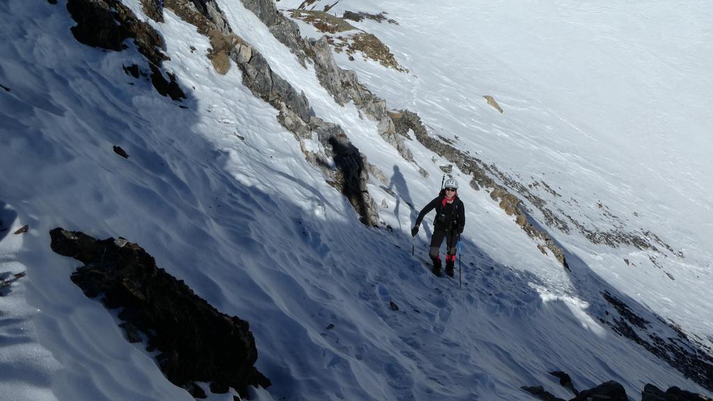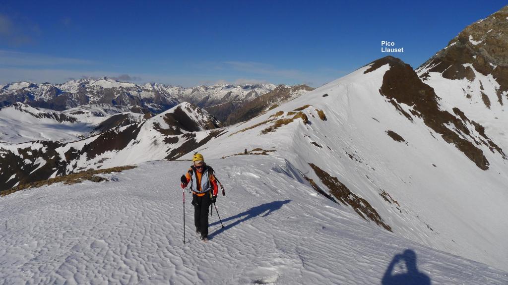 Un pequeño descanso en el collado y empieza la parte más técnica. Rodeamos el espolón rocoso norte del pico Llauset y enseguida tomamos una empinada ladera que nos lleva a la cresta, muy cerca del pico. Ricardo abre huella y, a pesar de la potente pendiente, la nieve se nota segura. Cima del pico Llauset (2904m 3h25′). Las vistas son espléndidas con este día de cielo despejado.