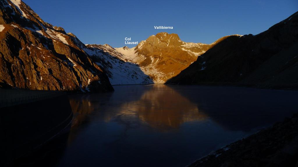 El largo túnel está iluminado, aunque habíamos tomado la precaución de traer frontales. A la salida aún hay otro pequeño túnel y por fin accedemos a la orilla del embalse de Llauset desde donde ya vemos el collado, el pico Llauset y la cresta que vamos a recorrer. Seguimos la dirección que indica al refugio del Cap de Llauset. El camino es claro, bordeando la orilla norte del embalse, pero se complica un poco por el hielo que se ha formado.