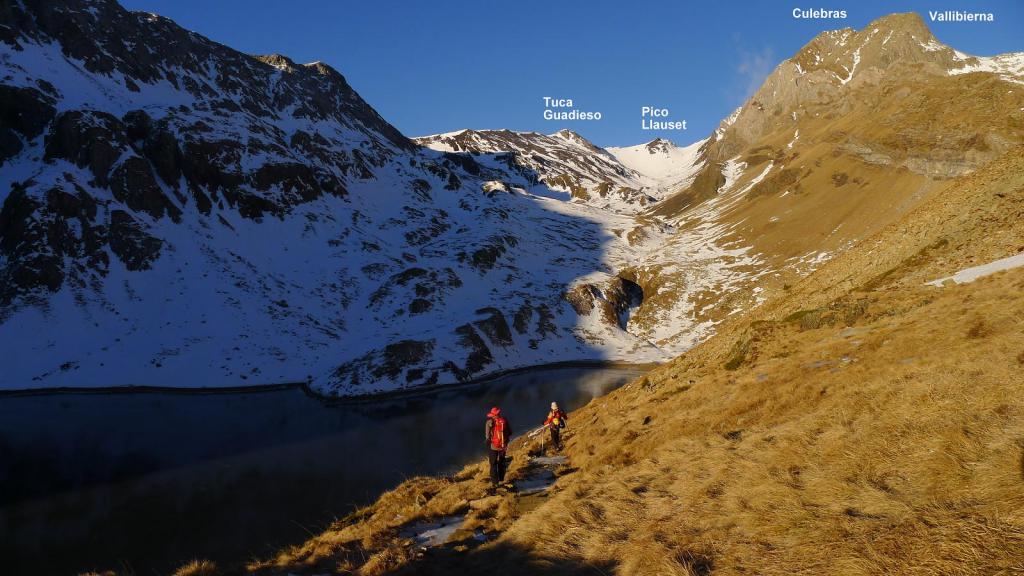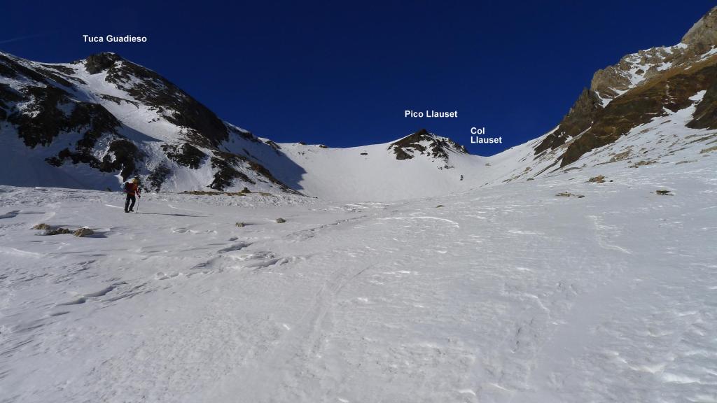 De vuelta al collado entre la tuca y el pico Guadieso (2745m 4h34′) descendemos (NE) hacia el valle de Llauset por la vaguada nevada. Enlazamos con el camino muy cerca del cartel de desviación al refugio. Regreso al aparcamiento (2090m 6h35′)