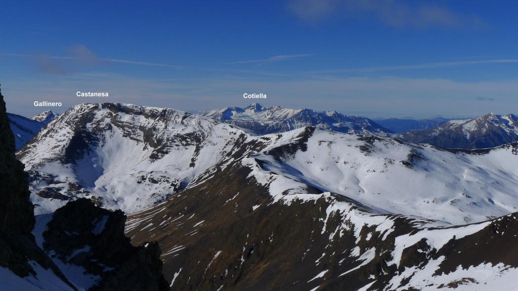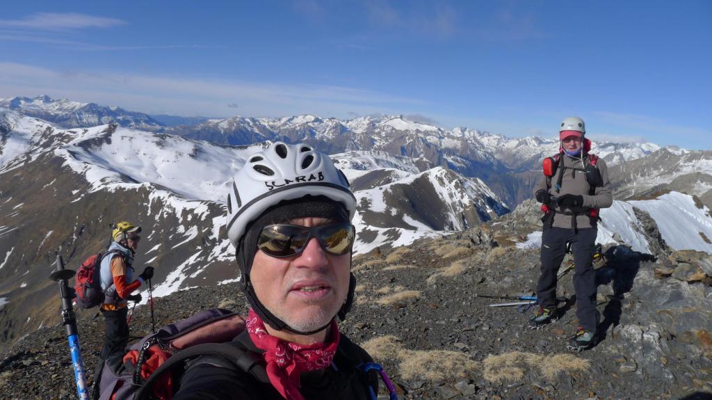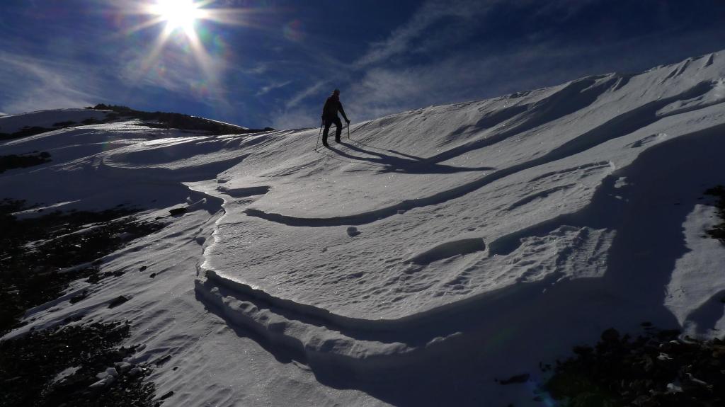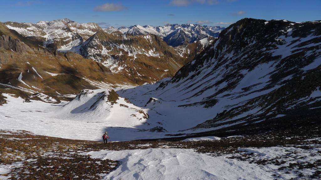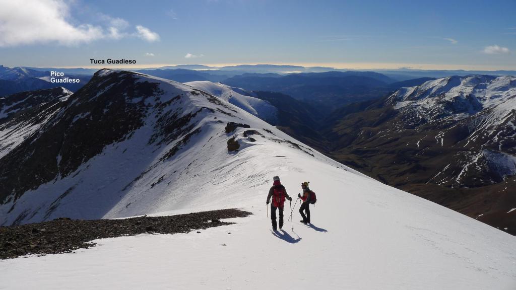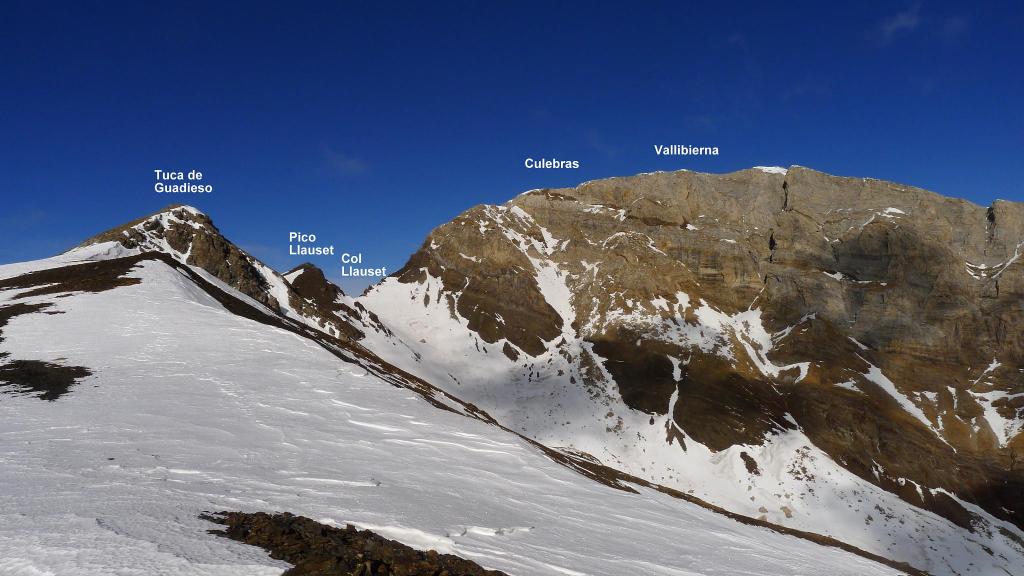 Recorremos la suave cresta hacia el SE. Contrasta con las verticales paredes del otro lado del valle, donde se alza el Vallibierna. Primero coronamos la Tuca de Guadieso (2881m 3h42′). Bajamos al collado entre los dos Guadiesos, decidiendo que ese será el punto para tomar el descenso, y subimos el pico Guadieso (2782m 4h20′) sin dificultad.