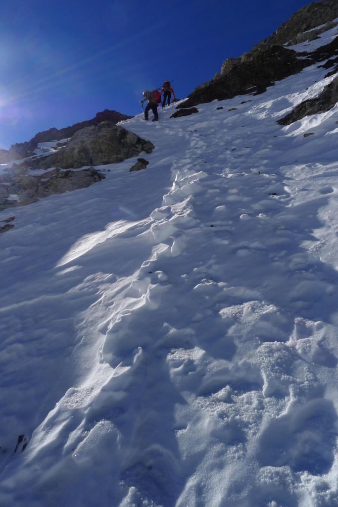 Terminado el embalse llegamos a otro cartel (2250m 1h10′), dejando a la derecha el camino al refugio, tomamos dirección pico Ballibierna por collado Llauset. Enseguida nos atamos los crampones y comenzamos la ascensión directa hasta el collado de Llauset (2869m 2h51′), con pendientes moderadas y nieve dura estupenda para cramponear.