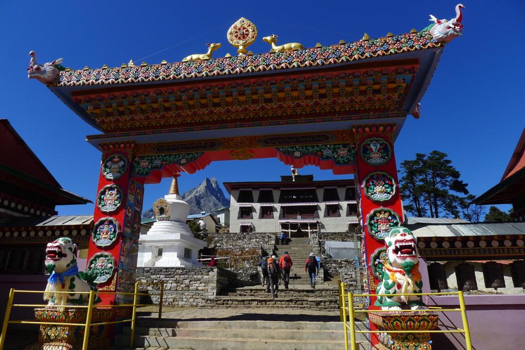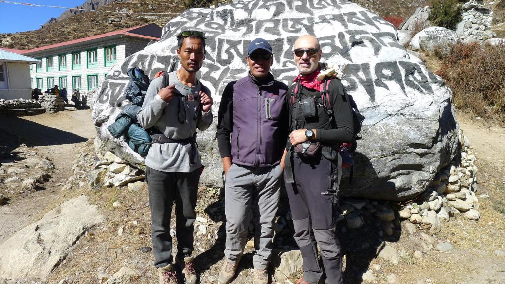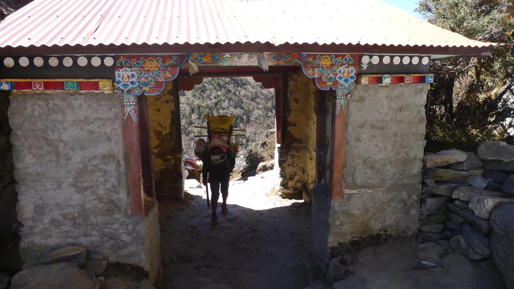 Tomamos una bifurcación a la izquierda (3990 1h31′) (a la derecha se dirige a Phortse). Pasamos el pueblo de Pangboche (3960m 1h39′). En Deboche (3730 3h17′) tenemos una cuesta arriba para llegar al templo de Tengboche (3860m 3h37′).El emplazamiento y la visita al templo son espectaculares. En el interior destaca el altar con un enorme Buda flanqueado de figuras y pinturas. En los bancos del recinto descansan las túnicas de los lamas. Las paredes están llenas de abigarradas y coloridas pinturas, todo en un estilo muy hinduísta. Es un poco sobrecogedor. (No se permite hacer fotos).