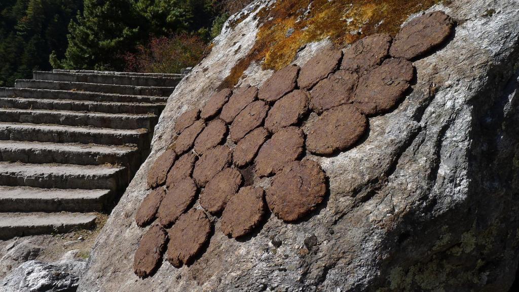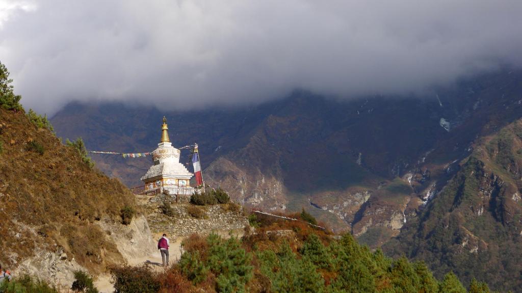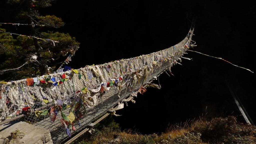 Periche (42650m). Empezamos bajando el valle. Enseguida tenemos detrás el Lhotse y la cresta del Nupse, e incluso se ve la punta del Everest. En la ruta de hoy vamos pasando por pequeños emplazamientos con lodges (Orsho 4100m 0h51′) y un par de pueblos más importantes. También empieza a haber más tráfico de gente subiendo; en un puente tibetano se forma un buen atasco con una manada de yaks. Van abundando las estupas.