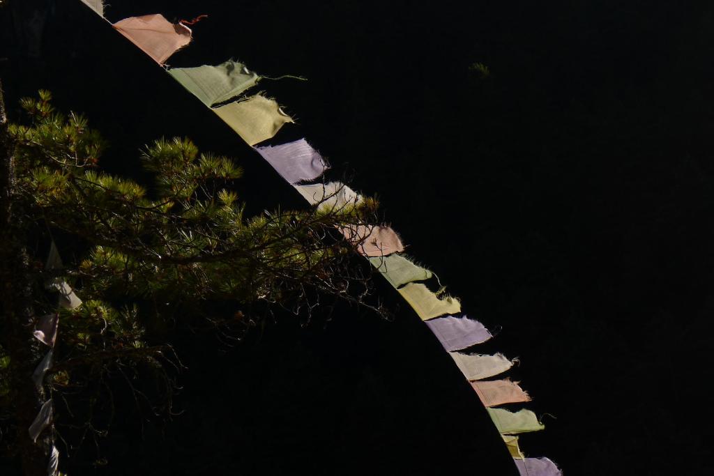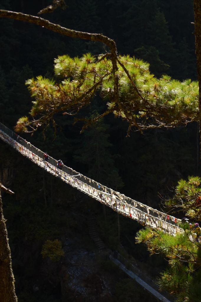 Tras la visita comenzamos una larga bajada. Hay mucha gente subiendo (les espera un fuerte subidón a pleno sol y, si aún están por aquí, sin aclimatación). Al llegar al fondo del profundo barranco, junto al río, comemos en Phunki Thanga (3310m 4h53′), un lugar con muchos restaurantes y mucha gente, pero Dawa nos lleva a uno muy tranquilo donde comemos muy bien.
