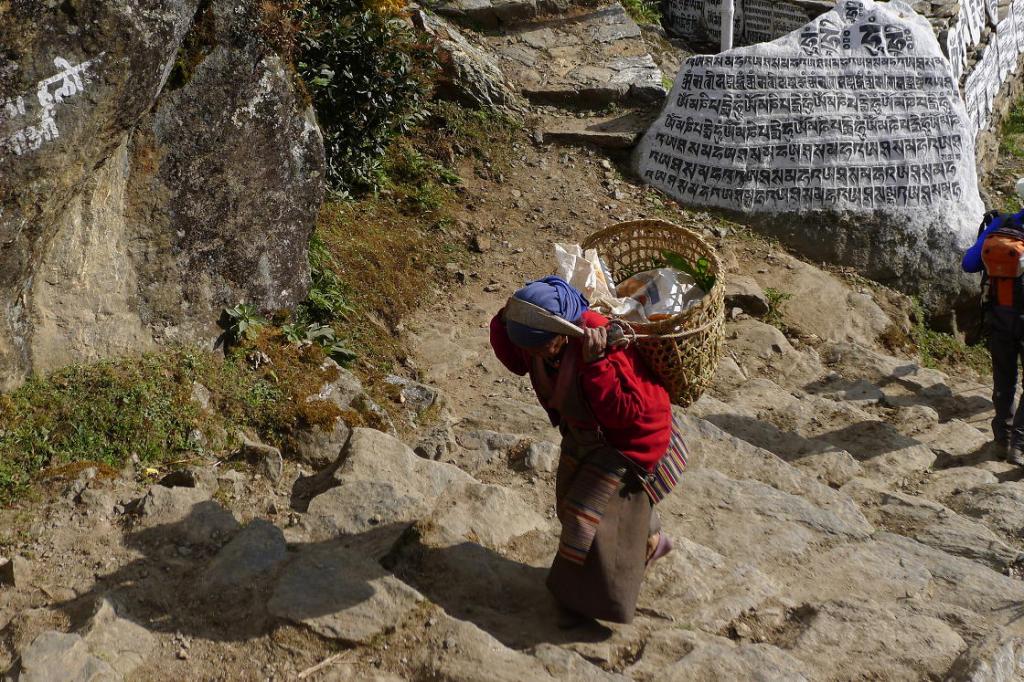 Pero casi nada más terminar hay que continuar y ahora es cuesta arriba, aunque, por suerte, a la sombra. La subida nos conduce al punto donde hace ya 10 días nos desviamos hacia Gokyo (unión de caminos 3590m 6h40′). Así que, ya por terreno conocido, llegamos a Namche Bazar (3430m 7h50′), al mismo hotel de la otra vez.