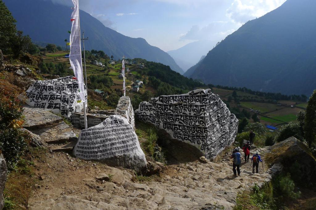 La mayor parte del camino de hoy ya la hicimos a la subida. Salimos de Namche (3430m) bastante tranquilos, pero enseguida la ruta empieza a estar muy concurrida. Vamos descendiendo el valle que cada vez se encajona más con laderas casi verticales cubiertas de vegetación. También hay cada vez más pueblitos, llenos de restaurantes, lodges y tiendietas.