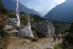 Periche (42650m). Empezamos bajando el valle. Enseguida tenemos detrás el Lhotse y la cresta del Nupse, e incluso se ve la punta del Everest. En la ruta de hoy vamos pasando por pequeños emplazamientos con lodges (Orsho 4100m 0h51′) y un par de pueblos más importantes. También empieza a haber más tráfico de gente subiendo; en un puente tibetano se forma un buen atasco con una manada de yaks. Van abundando las estupas.