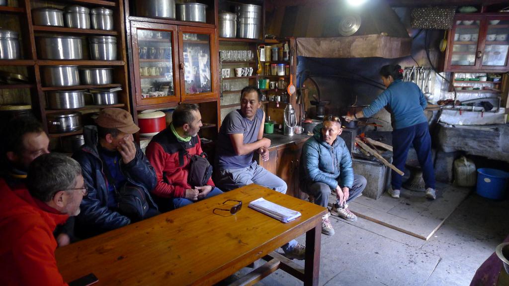 Kharikola está totalmente extendido por la ladera de la montaña, así que llegar al lodge nos cuesta otros 40′ por sendas de cabras. Solo llevamos 4 frontales y hay que andar con mucho cuidado. Llegamos al lodge después de otra jornada larga y dura y con Rinji que no se ha perdido ni una ronda de cerveza. En la cena nos ponen también otra bebida alcohólica que es como un barrilito lleno de unas hierbas fermentadas al que añaden agua caliente y se absorbe con un tubito, como el mate; se llama tomba.