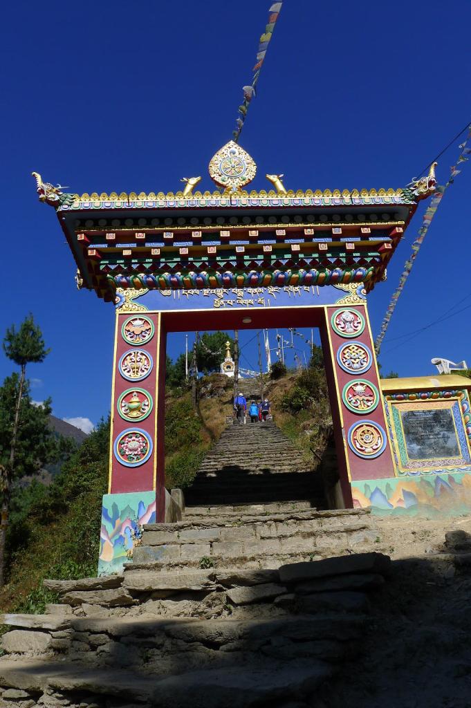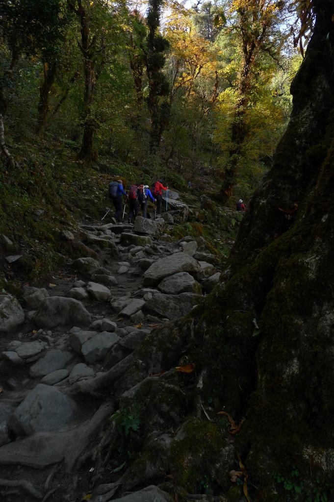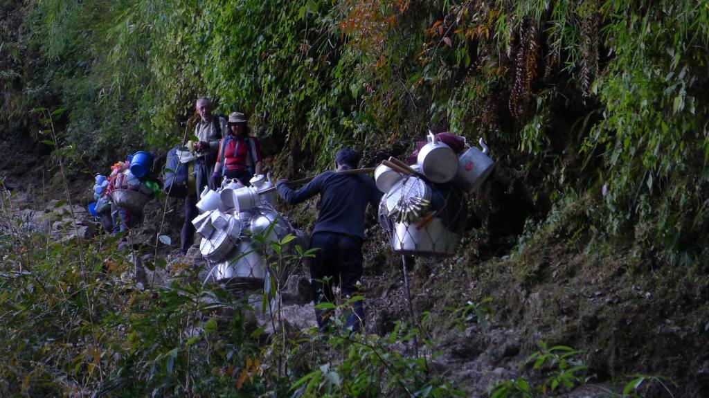 Surke (2280m). La salida de Surke es una buena cuesta arriba. Menos mal que la afrontamos de buena mañana y a la sombra. Las temperaturas por aquí ya empiezan a ser más altas. La vegetación es selvática. Prácticamente no hay turistas ni caminantes, solo nos cruzamos con gente local y un montón de recuas de mulas que llevan cargas hacia Lukla. Lo único que rompe la tranquilidad son los constantes aviones que salen o llegan a Lukla.