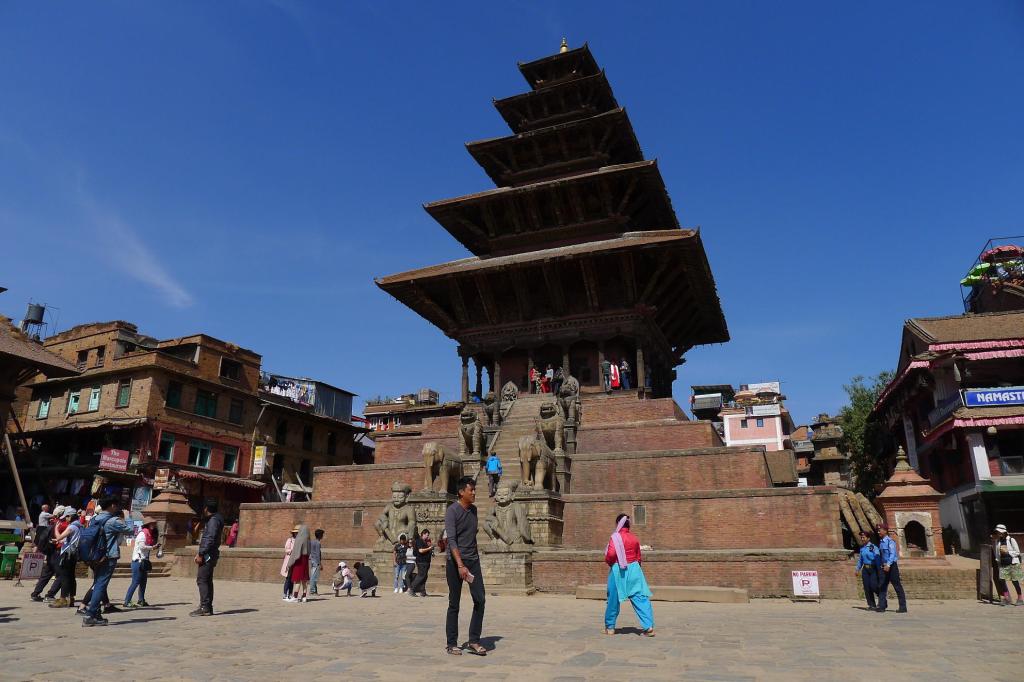Después nos llevan a bhaktapur Durbar Square, capital de Nepal en los siglos XVI al XIX. Se aprecian claramente los destrozos del terremoto de mayo 2015 y algunos edificios están en reconstrucción, rodeados de andamiaje de bambú.